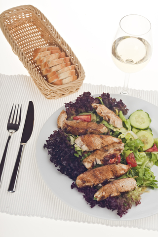 Postup: Jako první si uděláme marinádu na kuřecí maso. Do misky vlijeme pět lžic olivového oleje, přidáme do něj chilli, worcester a prolisovaný česnek, dle chuti přidáme sůl a pepř a vše společně smícháme. Kuřecí maso si očistíme, omyjeme a osušíme, nakrájíme na menší kousky, poté už jen vložíme do marinády a na hodinu uložíme do lednice. Zatím si můžeme připravit salát. Natrháme si kadeřavý salát a přidáme k němu rukolu. Nakrájíme na čtvrtky cherry rajčata a přihodíme k salátům. Vymačkáme šťávu z jedné limety a zalijeme jí salát. Nyní si rozpůlíme granátové jablko a vyklepeme z něj vařečkou nebo lžící zrníčka do salátu. Teď už nám zbývá si jen udělat karamelizovanou šalotku. Necháme na pánvi rozpustit máslo a dáme do něj na čtvrtky nakrájenou šalotku, čekáme, dokud není šalotka zlatavá, pak přidáme cukr a smažíme do doby, než nám cukr zkaramelizuje. Takto připravenou a vychlazenou cibuli přidáme do salátu, salát promícháme, osolíme a opepříme dle chuti. Dáme na chvíli chladit