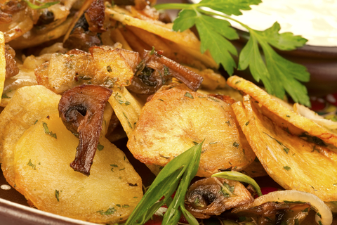 Ingredience: 800g brambor, 250g čerstvých žampionů, 1 cibule, olivový olej, medvědí česnek, hladkolistá petržel, pažitka, libeček, rozmarýn, sůl