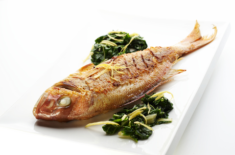 Zatímco se ryba griluje, připravíme si vařený mangold. Na olivovém oleji podusíme mangold, do něhož poté přidáme prolisovaný česnek, lžičku citronové kůry a zakysanou smetanu. Mangold se dá nahradit lépe dostupnějším listovým špenátem. Rybu grilujeme v alobalu zhruba 15-20 minut na nepřímém ohni. Při servírování můžeme ozdobit citrónovou kůrou.