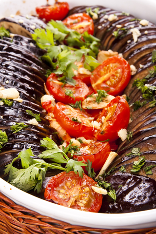 Postup: Zbavíme papriku jadérek a bílých částí, posléze pečlivě omyjeme. Papriku nakrájíme na kostky velké zhruba 2x2cm. Cherry rajčata necháme nejlépe vcelku, pokud jsou větší velikosti, rozkrojíme je napůl. Cuketu omyjeme a nakrájíme na kolečka a stejně nakrájíme i omytý lilek. Takto nakrájenou zeleninu vložíme do mísy, přidáme do ní i cibuli nakrájenou na kolečka a česnek nakrájený na plátky. Zeleninu pokapeme balsamicem a nalijeme 4 lžíce oleje. Poté přidáme střídmě bylinky (oregano, tymián). Nejlepší jsou na drobno nasekané čerstvé bylinky, je však možné použít i sušené bylinky. Vše v míse smícháme a zelenina je připravená ke grilování. Zeleninu rozprostřeme na grilovací tácek nebo můžeme napíchnout na jehlu. Grilujeme zhruba 5 minut. Připravíme si dip – smícháme zakysanou smetanu a jogurt, přidáme prolisovaný česnek a osolíme a opepříme dle vlastní chuti.