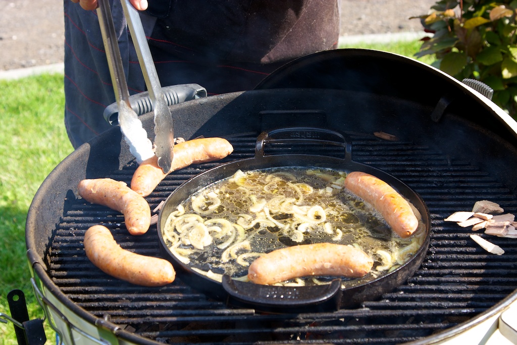 Postup:  Klobásy grilujeme na mírném ohni z každé strany tak, aby získali zlatavou barvu. Souběžně s klobásami pak na rozpáleném sádle osmahneme na kolečka pokrájenou cibuli, kterou doplníme rozetřeným česnekem. Cibuli necháme zesklovatět, a přilijeme opatrně světlé pivo, případně pak víno, a cibuli s česnekem mírně podusíme. Pak přidáme na pánev již grilované klobásy,  a necháme dojít na mírném ohni.