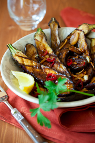 Postup: Nejprve si připravíme marinádu z výše uvedených surovin. Do sezamového oleje nakrájíme čerstvé nebo sterilované papričky. Pokud máte rádi pikantnější věci, papriček dejte více. Přidáme na jemno nastrouhaný zázvor, prolisovaný česnek, vymačkanou šťávu z citrónu a sůl. Lilek omyjeme a rozkrojíme podélně napůl. Poté vložíme do marinády a necháme v lednici minimálně půl hodiny marinovat. Lilek dáme na gril a grilujeme z obou stran zhruba 3-4 minuty, je dobré potřít lilek marinádou i v průběhu grilování. Lilek je možné použít jako přílohu k masu, ovšem je vhodný i jako chuťovka v průběhu grilování.
