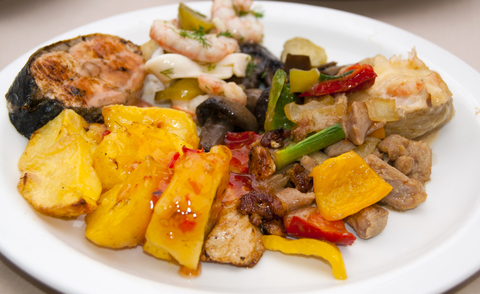 Ingredience: 200g krevet, 300g lososa, 1 menší lilek, 1 střední cuketa, 1 menší červená paprika, 1 menší žlutá paprika, 1 menší zelená paprika, 4 stroužky česneku, 400g batátů (sladké brambory), 1 cibule, kopr, citronová šťáva, olivový olej, mořská sůl