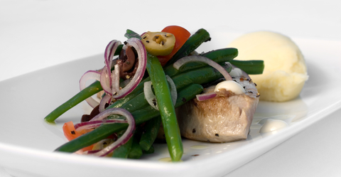 Postup: Jako první si omyjeme a papírovými utěrkami osušíme steaky z tuňáka. Na hodinu dáme do lednice marinovat v marinádě, kterou si uděláme tak, že smícháme olivový olej, citronovou šťávu a namletý bílý pepř. Mezitím si připravíme salát z fazolek, který je poté potřeba také vychladit v lednici. Jako první si musíme uvařit zelené fazolky, neměly by být rozvařené, spíše na skus tvrdší. Vychladlé je dáme do mísy. Vezmeme rajčata a nakrájíme je na slabé plátky stejně jako červenou cibuli, přidáme vše k fazolkám. Dochutíme ještě na kolečka nakrájenými olivami, olivy mohou být plněné např. paprikou, mandlí nebo jinými surovinami. Nyní si uděláme zálivku do salátu. Smícháme olivový olej, vinný ocet, bazalku, oregano a sůl. Veškerou zeleninu promícháme se zálivkou. Sálat máme hotový, a tak si ještě doděláme na grilu steak. Tuňáka děláme na grilu zhruba čtyři minuty z každé strany, poté stejně jako u jiných steaků ho osolíme a necháme asi tři minuty odpočinout. Ke steaku se zeleninou si ještě můžeme udělat česnekový dresink z jogurtu a česneku. Osolíme ho a můžeme ochutit vlastními bylinkami.
