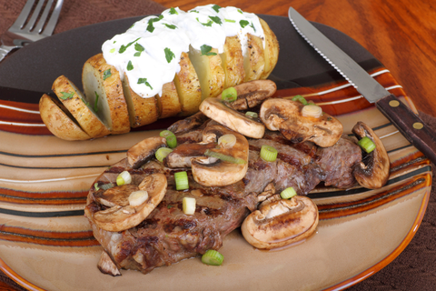 Postup: Nejprve si připravíme brambory, poněvadž se grilují poměrně dlouho (zhruba hodinu). Omyjeme a očistíme si brambory, je lepší je nechat ve slupce, jelikož jim to dodá lepší chuť. Krájíme na zhruba centimetrové plátky, ale nedokrajujeme do konce, aby se nám brambora nerozpadla. Do každé mezery vložíme kousek másla, osolíme, posypeme čerstvým libečkem a celou bramboru zabalíme do alobalu. Takto zabalenou bramboru dáme na gril. Nyní se přesuneme k přípravě masa a žampionů. Maso potřeme olejem po obou stranách a vložíme na rozpálený gril. Hlídáme si čas, abychom měli steak dle chuti (z každé strany 3 minuty rare, 4-6 minut medium a 6-8 minut hodně propečený). Nakonec steak osolíme a opepříme. Žampiony nakrájíme na plátky a osmažíme na rozpáleném olivovém oleji, dle chuti osolíme a přidáme trochu tymiánu. Houby přelijeme přes steak a podáváme s bramborou. Na bramboru je dobré udělat dresink ze zakysané smetany, jarní cibulky a česneku, můžeme také dle chuti přidat sůl či jiné bylinky.