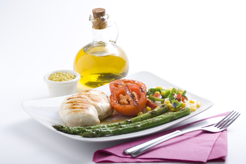 Postup: Smícháme bílý jogurt s olejem a vymačkanou šťávou z citrónu, osolíme a opepříme dle chuti. Do této směsi naložíme tak na půl hodiny omytá a očištěná kuřecí prsa. Zatímco se nám maso marinuje, připravíme si veškerou zeleninu. Rajčata si překrojíme napůl a posypeme medvědím česnekem. Chřest si připravíme pouze tak, že odkrojíme tvrdé konce. Nyní si uvaříme dušenou zeleninu. Nakrájíme si na malé proužky očištěnou červenou i zelenou papriku. Papriku dáme na rozpuštěné máslo a ochutíme bylinkami (ty mohou být čerstvé i sušené). K paprikám přidáme nakrájenou baby karotku, hrášek i kukuřici. Pokud nemáme tyto tři suroviny čerstvé, nevadí, dají se použít i mražené. Je pouze potřeba zbavit je přebytečné vody. Zeleninu nedusíme až úplně do měkka, necháme ji tvrdší. Když máme zeleninu hotovou, dáme na gril maso s chřestem a rajčaty. Grilované maso servírujeme s rajčaty, chřestem a dušenou zeleninu. Chřest i rajčata můžeme ještě dochutit solí.