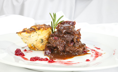 Ingredience: 800g – 1kg srnčího masa, 180ml červeného vína (suché), 70ml slunečnicového oleje, 1 střední mrkev, celer, 2 střední cibule, 1 hřebíček, 1 bobkový list, 5 kuliček černého pepře 2 stroužky česneku, 1 lžíce sádla, 250ml vývaru, 5 lžic brusinkového kompotu, dle potřeby: sůl, pepř, mouka, citronová šťáva