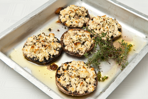 Postup: Jako první si musíme odstranit nožičky žampionů, následně kloboučky žampionů očistíme. Když máme žampiony očištěné jsou připraveny na další kroky. Uvnitř je lehce potřeme olivovým olejem. Na pánvi si orestujeme na malé kostičky nakrájenou slaninu. Orestovanou slaninu si dáme do misky a přidáme k ní nadrobno nakrájené černé olivy, společně zamícháme a ochutíme nasekaným čerstvým tymiánem. Do takto připravené směsi už stačí přidat pouze nakrájený sýr feta. Někdo tento sýr nahrazuje balkánským sýrem, ovšem feta sýr je mnohem chutnější, dokonce se skvěle hodí kozí sýr podobného typu. Touto směsí poté plníme jednotlivé žampiony. Připravené žampiony zbývá jen dát na lehce rozpálený gril. Žampiony se grilují chvíli a sýr se musí v žampionech rozehřát. Žampiony podáváme teplé pro lepší zážitek z jídla.
