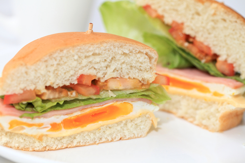 Ingredience: 4 housky na burgry, 2 velká rajčata (typ rajčat volíme dle toho, aby měla co nejvíce dužiny), listy hlávkového salátu, 4 plátky šunky, 4 plátky sýru, 4 vejce, 2 lžíce olivového oleje, 1 lžíce octa, oregano, bazalka, sůl a pepř